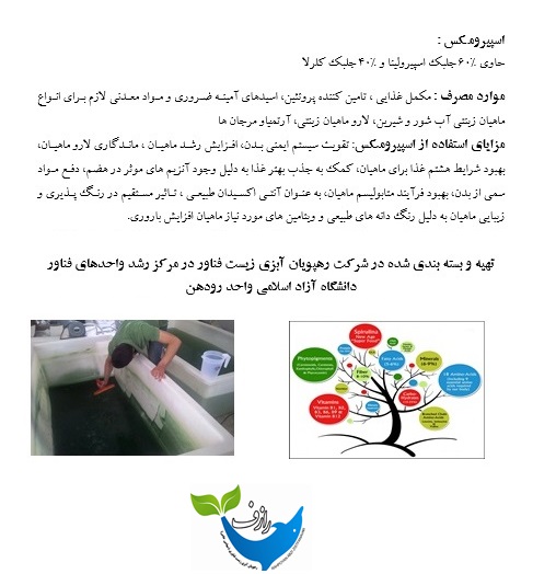 این محصول دارای پلانکتون های غذایی مورد نیاز است. نقش بسیار مهم و چندمنظورهای در صنعت آبزیپروری و آکواریومی ایفا میکند، هم به عنوان مکمل غذایی برای ماهیان زینتی و هم به عنوان خوراک ماهی در مقیاس مزرعهای استفاده میشود.سرشار از پروتئین (تا ۶۰-۷۰ درصد وزن خشک)، ویتامینها، مواد معدنی، اسیدهای چرب ضروری (مانند امگا ۳ و امگا ۶)، فایکوسیانین و کاروتنوئیدها است، که باعث افزایش رشد، بهبود رنگ بدن، ارتقاء تولیدمثل و تقویت سیستم ایمنی ماهیهای آکواریومی و زینتی میشود.افزایش مقاومت در برابر بیماریها و تحریک سیستم ایمنی به دلیل دارا بودن فایکوسیانین و ترکیبات آنتیاکسیدان، سبب کاهش عوارض بیماری و تلفات میشود. کاروتنوئیدها و فایکوسیانین به شدت رنگ طبیعی ماهیها کمک کرده و بهبود ظاهر آنها را تسریع میکند.اسیدهای چرب ضروری مانند گاما-لینولنیک پیشساز هورمونهای تولیدمثل است لذا این محصول نقش مؤثری در افزایش تخمگذاری، کوتاهشدن دوره آمادگی جنسی و رشد تخمدانها نیز دارد. از طرف دیگر به عنوان یک مکمل پروتئین گیاهی مقرونبهصرفه، جایگزین عملی برای پودر ماهی شده و هزینه خوراک را کاهش میدهد. کاربرد خانگی و تجاری آن در آکواریومهای خانگی و همچنین مزارع پرورش ماهیهای زینتی و اقتصادی مانند گوپی، گورامی، کوی، سیچلاید، بلکمولی و قزلآلا، و بصورت مستقیم و هم در ترکیب با غذای کارخانهای استفاده میشود.